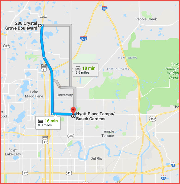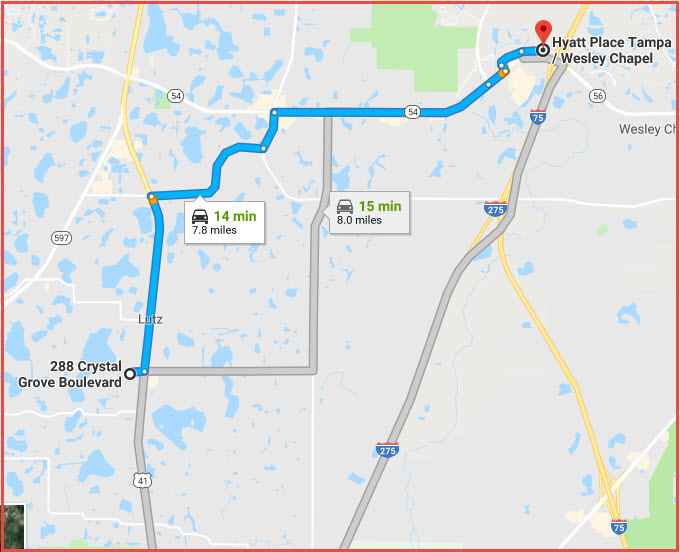 As an alternative to a chain hotel, one might consider more private accommodations through a booking service like AirBNB. Just go to www.AirBNB.com and search on Lutz, FL 33548. The links to ones that others have enjoyed are HERE, HERE (lakeside, 2 bedrooms and pet-friendly, about 1 mile from our office), and HERE (2.3 miles / 4 minutes from the office).