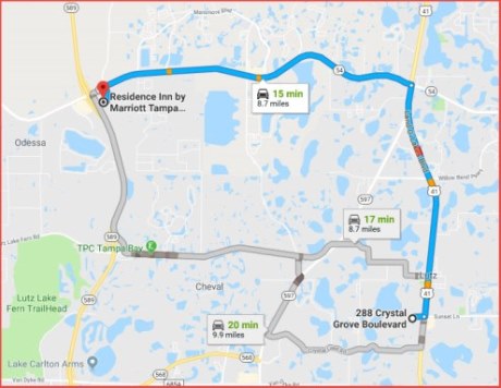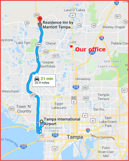 If you are arriving at TIA on the day before your visit (as either a TRAINEE or as a patient), you may consider staying at the Residence Inn by Marriott in Lutz. It is the nicest hotel close to our office, and, like all Residence Inns, a great breakfast is included. It is about 20 miles north of the airport via the Suncoast Parkway. The official website is HERE. Right next door is a Hilton Garden Inn whose website is HERE, also nice but no free breakfast.