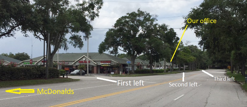 If you are arriving from out of town via Tampa International Airport and coming directly to the office, take I-275 north to Exit 53 (Bearss Avenue), turn right at the end of the ramp, drive about 100 yards to Nebraska Avenue, and turn left on Nebraska. Exactly 4.0 miles north of that intersection is the turn onto Crystal Grove Boulevard (first map on this page, above).