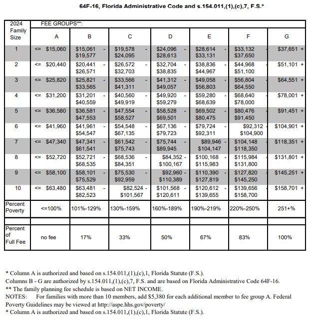The extent of an individual's coverage depends upon his income and number of dependents, as well as upon the county in which he is seeking services. For example (and this information may change with time), Pinellas, Pasco, Hernando, Hillsborough and Charlotte Counties recognize all fee groups (A-G) below, can accommodate those who qualify for partial funding (Groups B-G), and will provide services for a fee (check with the individual county) to those who do not qualify for any coverage. Citrus County covers 100%, but only for men who fall into columns A or B or the Sliding Fee Scale below. Some counties have arrangements for providers to perform vasectomies in their county clinic facilities; other counties arrange for procedures to be done in private doctors' offices or Planned Parenthood clinics. Some counties will deny Title X coverage to a man with health insurance even if the insurance deductible is high (sometimes more than the vasectomy fee) and he qualifies for assistance based upon income and family size. Under Title X rules, county health departments may not restrict allocation of the Title X funds to residents of their own counties. Therefore, men who qualify may receive funding for services in any county.
